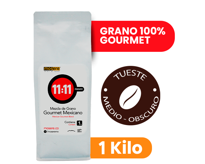 Café MOSERE 11:11 en su presentación de 1 Kg, está conformado por una mezcla de granos extraídos de plantaciones 100% Arábica que se encuentran a una altura superior a los 1,100 msnm, traemos en cada taza un legado de amor por la tierra, de cuidad y años de experiencia acumulado en manos de familias de agricultores Mexicanos que han velado por las hermosas y delicadas plantas de café.